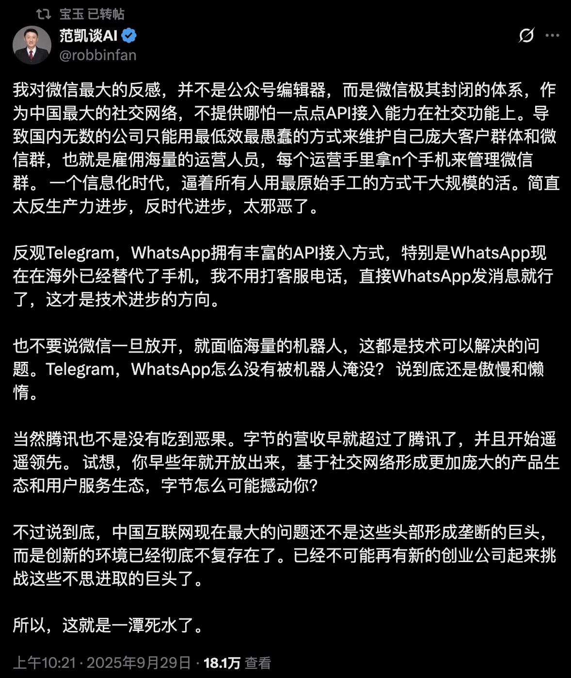 在刷 X 的过程中,我还看到一个大 V 转发了一个某公司前 CTO 的动态,看写得很长,实际上一点「信息增量」都没有……