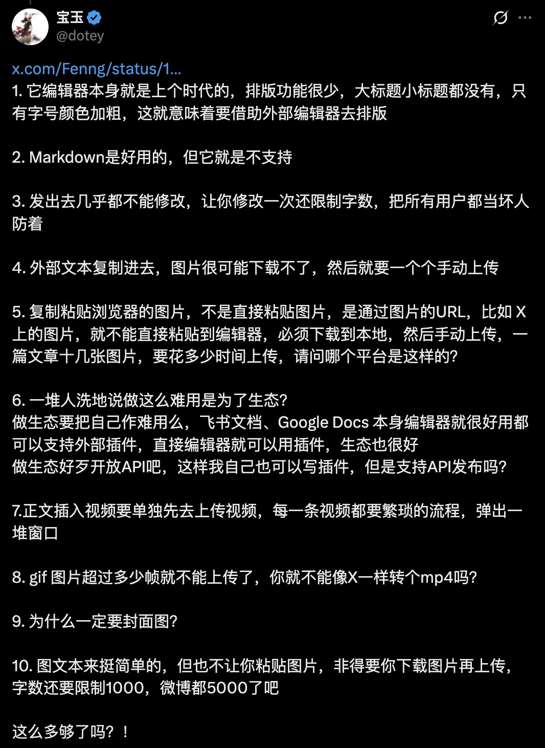 下图是本次参与吵架的其中一个大 V 列出的公众号难用的 10 个槽点,感兴趣的朋友可以看看👀